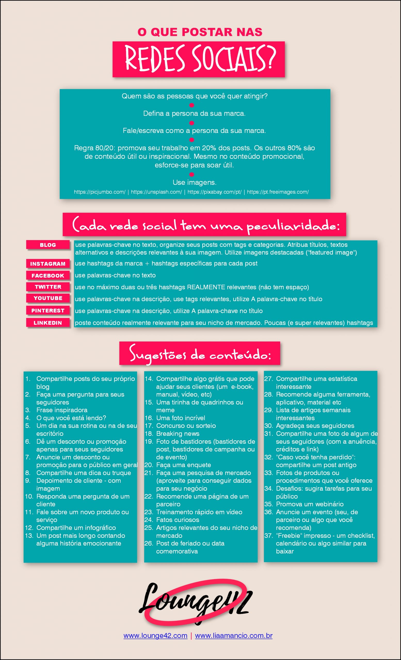 Compilei aqui nesta imagem (clique para vê-la em tamanho decente para dar leitura) várias ideias de posts, para que você nunca fique sem conteúdo: