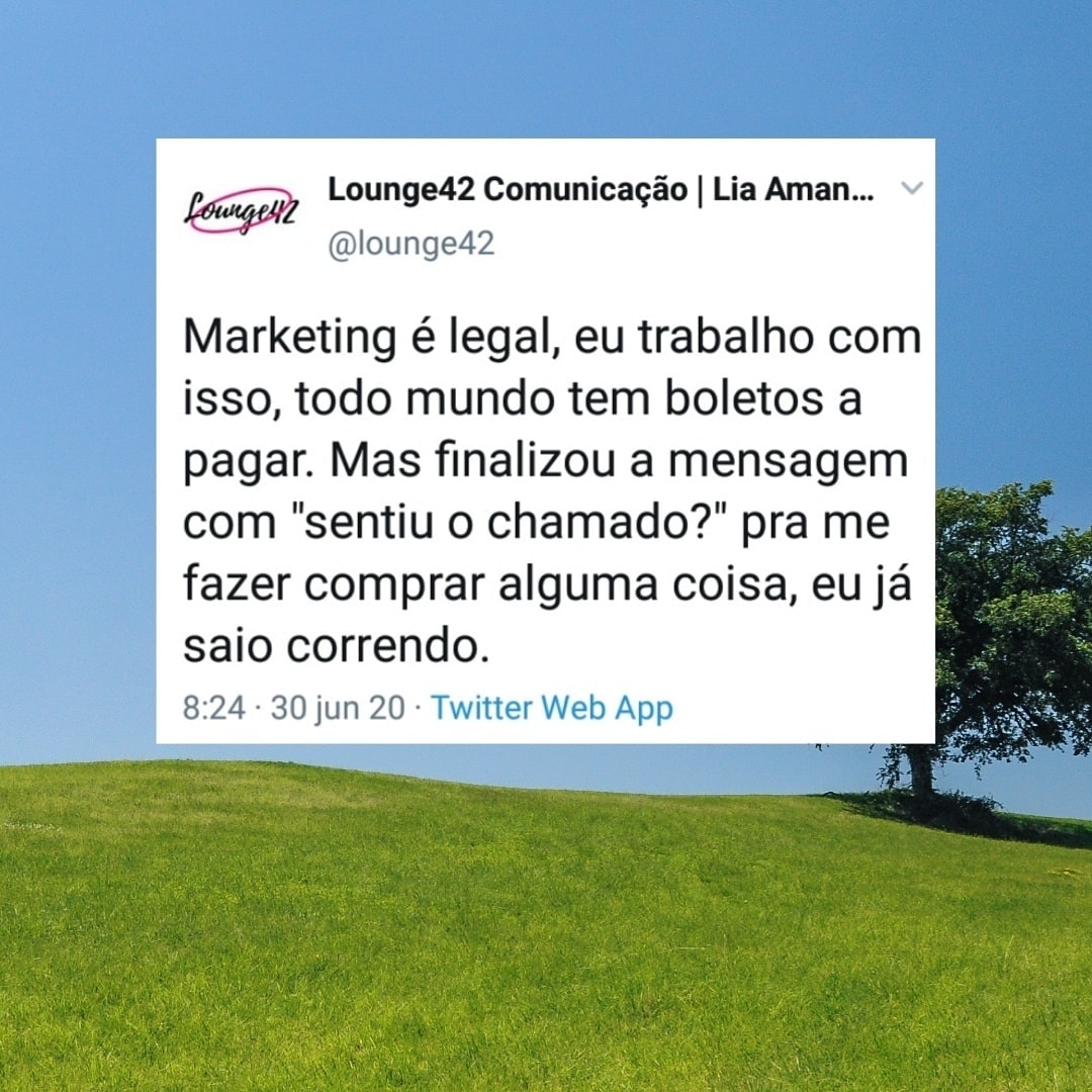 Senti o chamado de correr pras montanhas, isso sim. Onde já se viu apelar pro emocional pra fazer alguém gastar um dinheiro que não tem em algo que não precisa? Mais amor nas vendas, por favor. ❤